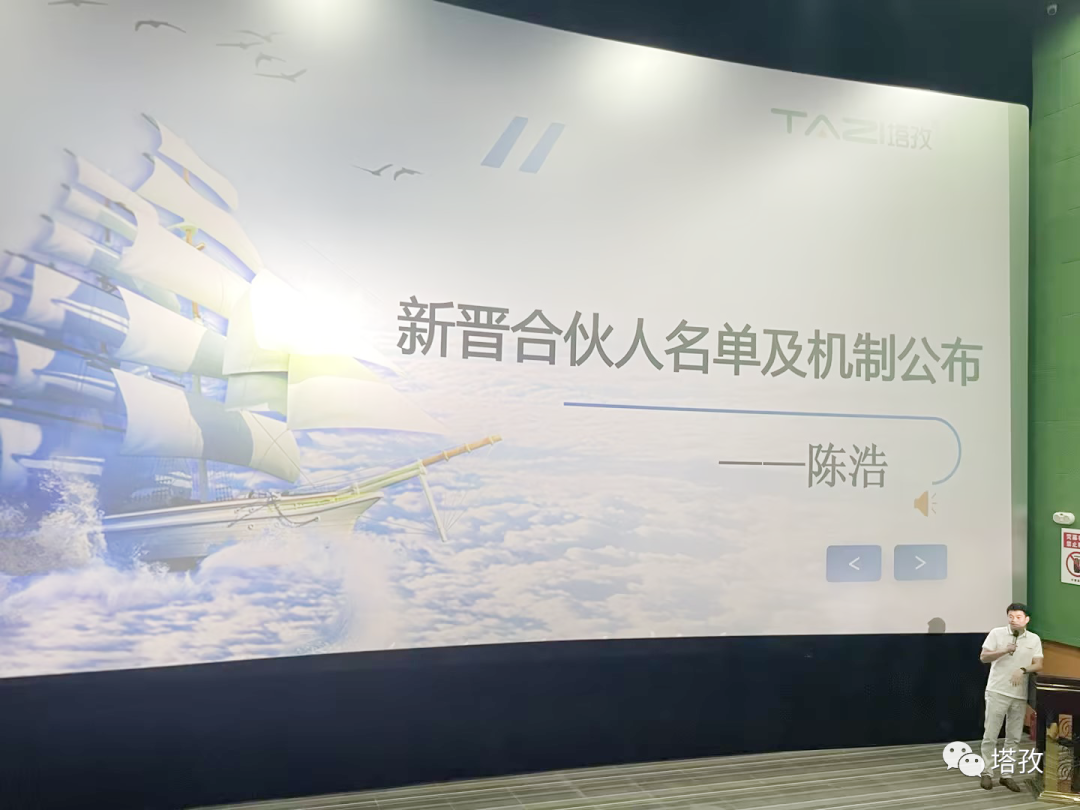 會上,塔孜聯(lián)合創(chuàng)始人陳浩先生做了集團合伙人機制公布。合伙人機制是為了激勵核心員工與企業(yè)共成長,并分享公司發(fā)展和成長的利益來制定的分紅辦法。