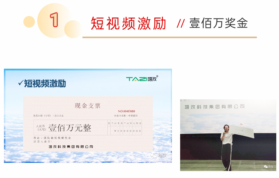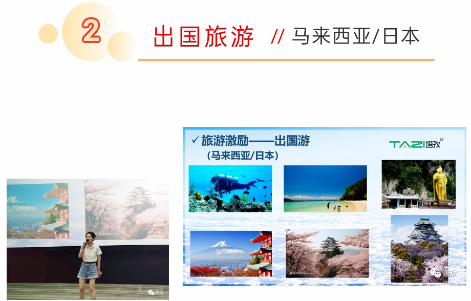 接下來是一個振奮人心的好消息,大會由揚州分公司經(jīng)理吳總和蚌埠總經(jīng)理鄒總,分別為大家公布集團下半年激勵政策:“短視頻激勵壹佰萬獎金”和“馬來西亞/日本”出國旅游。